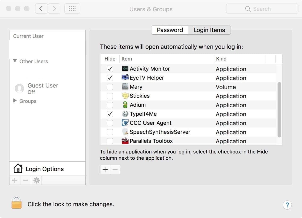Choose an unwanted startup program to remove and click the minus button to clear it from the list.