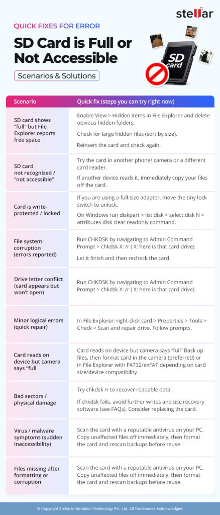 Getting the “SD card is full or not accessible” error is frustrating for sure but it’s actually quite fixable. First check if that card really has space, then try simple steps like using in another device, clearing local caches, or even running Windows repair tools. Use CHKDSK or maybe change the drive letter as well. As a last resort, just format the card after backing up data of yours. If photos or files do go missing, then photo recovery software can actually bring them back. Always remember… eject your SD card safely, keep backups of important files and keep scanning for malware every now and then. With these precautions and fixes in use… you can basically troubleshoot the error and avoid losing your valuable photos.