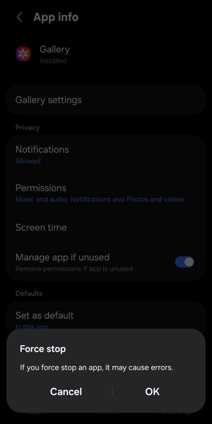 One other option is try is Force Stop the gallery app, this will end any background processes for the app and help fix any temporary system conflicts. This can also give the app a fresh start. Go to the app’s menu – Settings > Apps > Gallery.