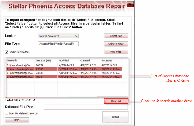 Step 2:- List of all searched access files in a drive. Now select your file to repair.
