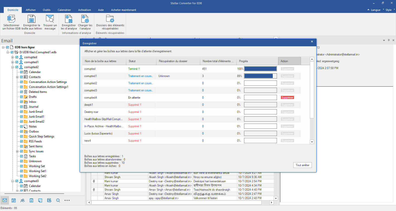 Le logiciel commencera à exporter les boîtes aux lettres sélectionnées au format PST vers le bureau que vous avez spécifié. Vous pouvez également supprimer les boîtes aux lettres dont le statut est « En attente » de la liste en cliquant sur le bouton « Supprimer », ou arrêter l'ensemble du processus d'enregistrement des boîtes aux lettres en cliquant sur le bouton « Tout arrêter ».
