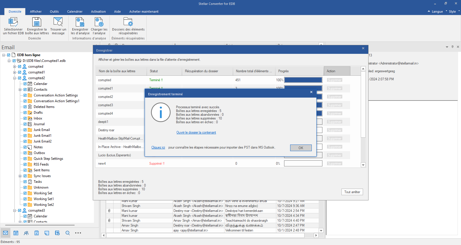 La boîte de dialogue « Enregistrement terminé » s'affiche. Elle contient un aperçu des boîtes aux lettres enregistrées, annulées, supprimées et ayant échoué. Veuillez cliquer sur « OK » pour la fermer.