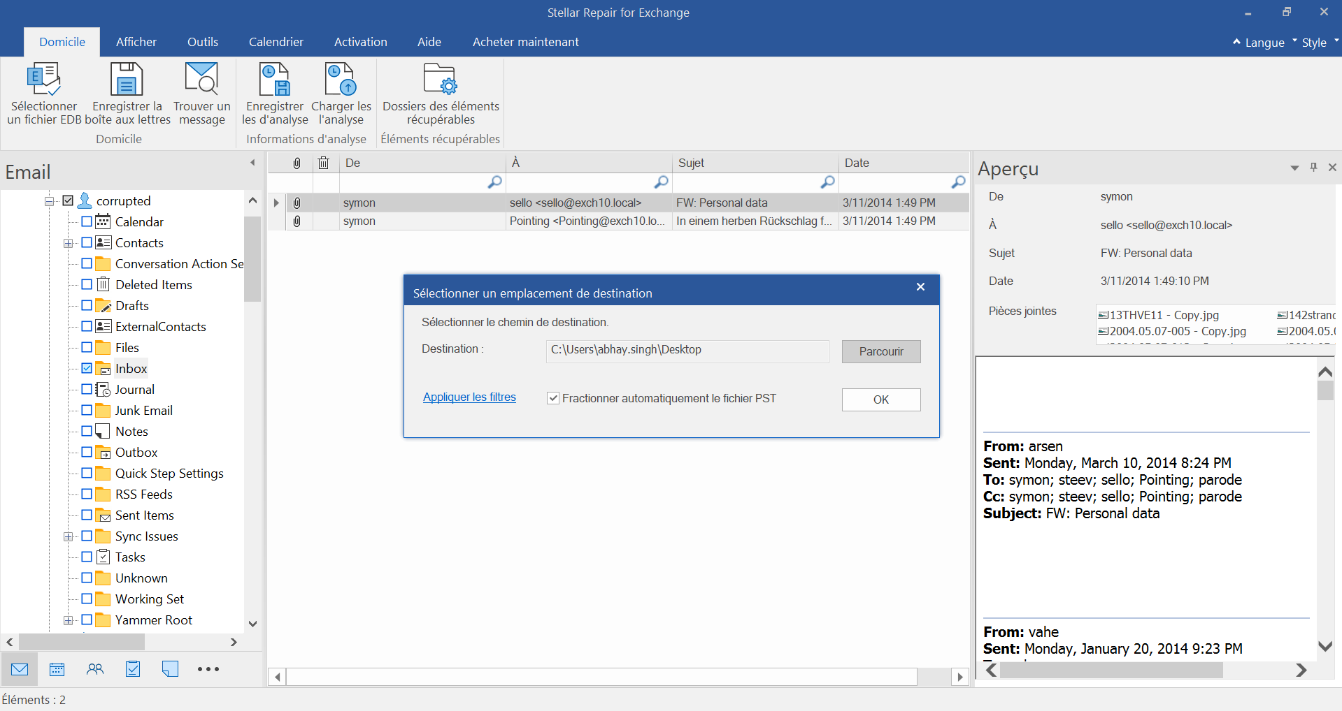 Cliquez sur Parcourir pour sélectionner le bureau où vous souhaitez enregistrer les fichiers PST. Cliquez ensuite sur OK. Si vous souhaitez diviser le fichier PST converti en segments plus petits, sélectionnez Diviser le fichier PST automatiquement. Vous pouvez également utiliser l'option Appliquer un filtre pour exclure ou comprendre les courriels.