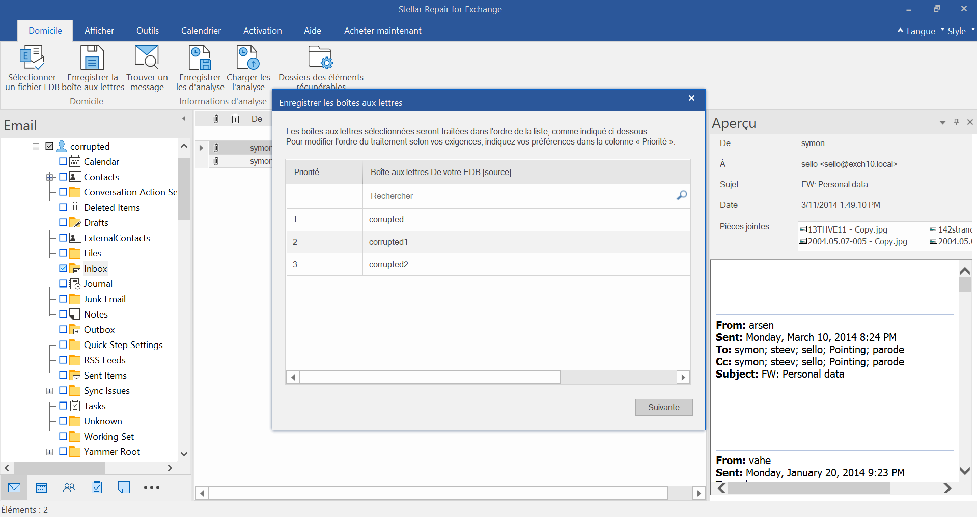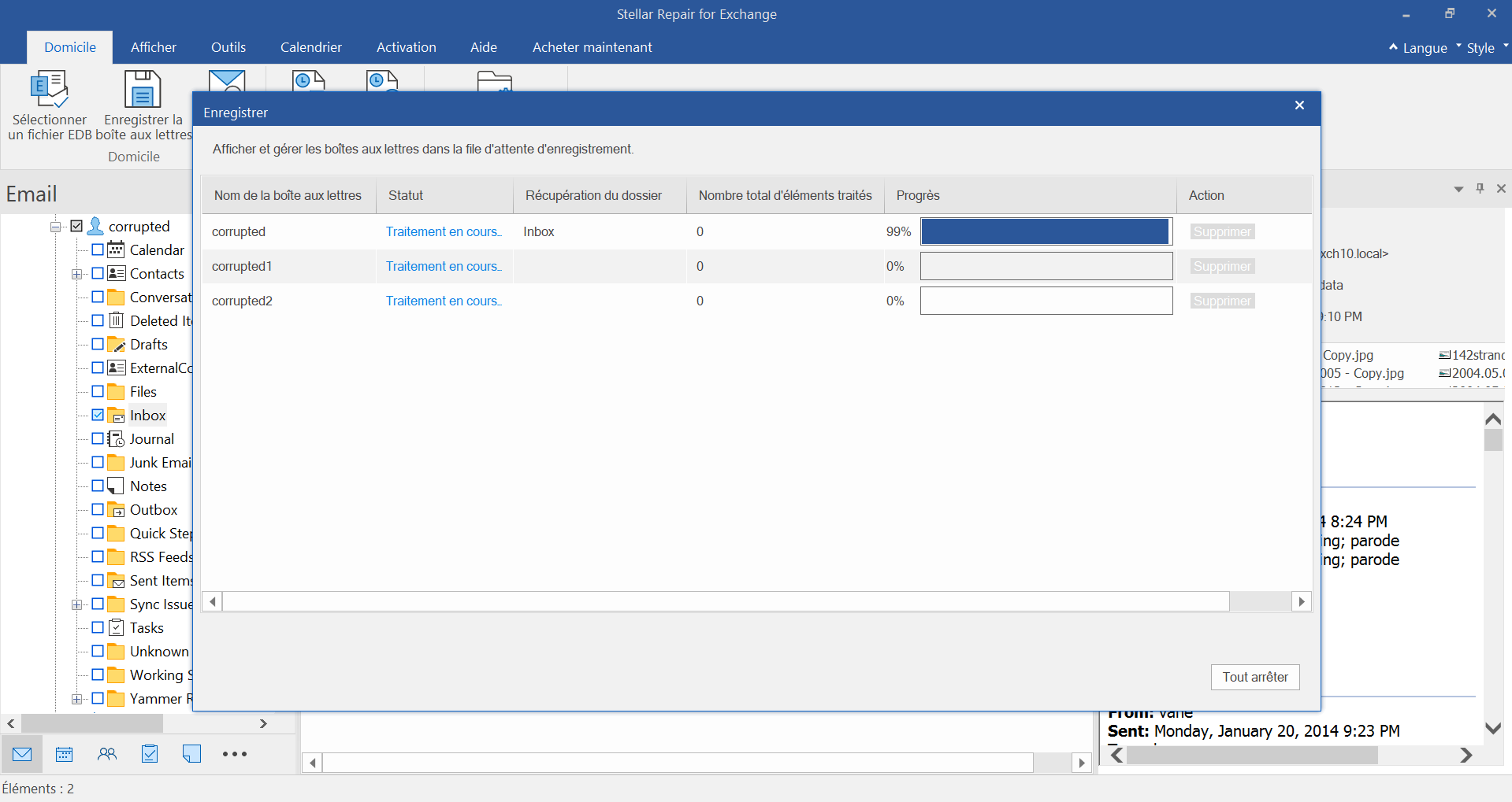 Lorsque l'analyse est terminée, le logiciel répertorie toutes les boîtes aux lettres récupérables dans le volet de gauche. Vous pouvez prévisualiser les données récupérables. Sélectionnez ensuite toutes les boîtes aux lettres ou des boîtes aux lettres spécifiques que vous souhaitez remettre en état et cliquez sur Enregistrer la boîte aux lettres dans l'onglet Démarrer.