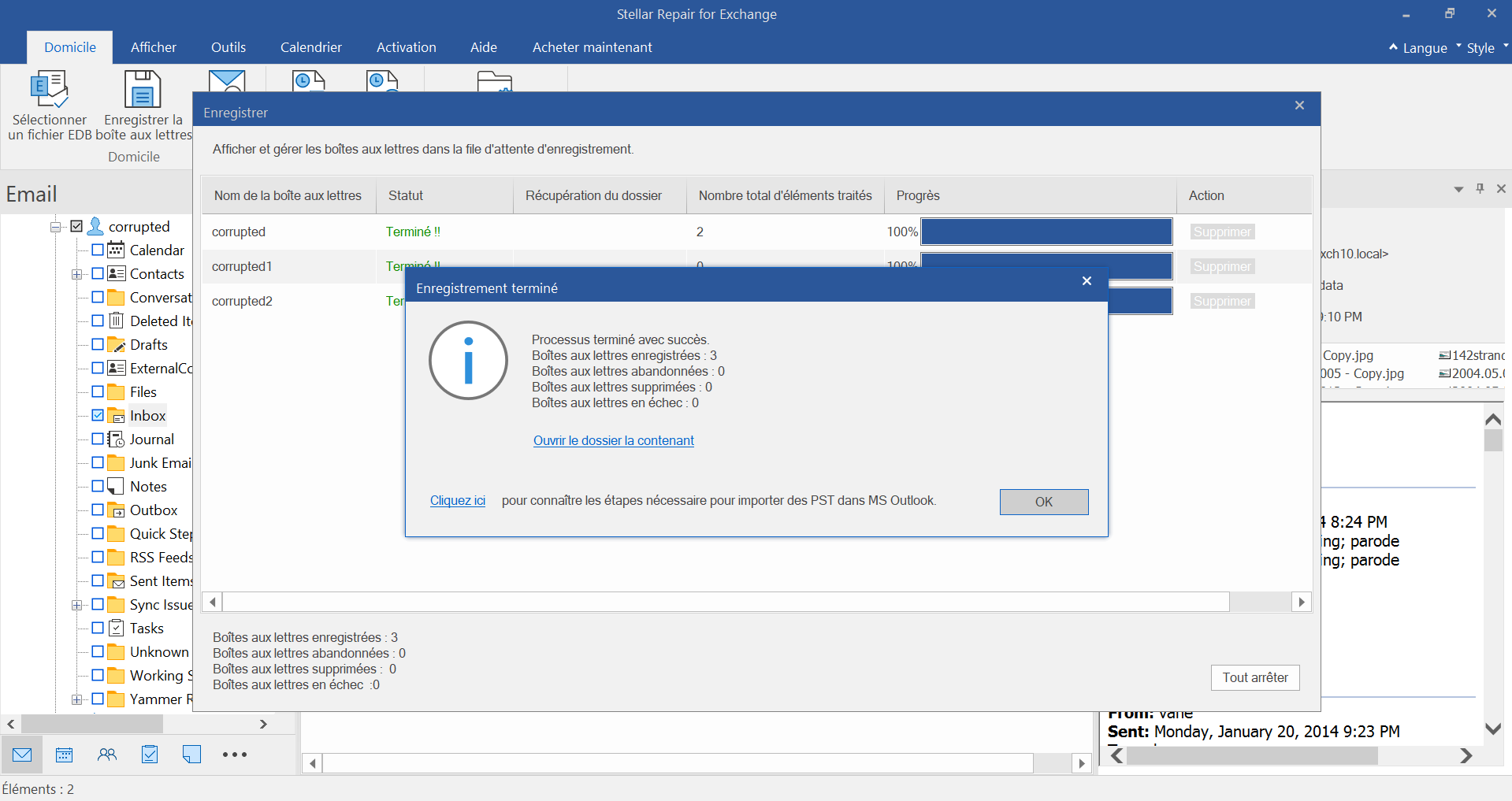 Une boîte de dialogue Enregistrer complet s'ouvre, dans laquelle un résumé des boîtes aux lettres enregistrées est affiché. Pour ouvrir le dossier contenant les fichiers PST, cliquez sur Ouvrir le dossier contenant. Cliquez sur OK pour terminer le processus d'enregistrement.