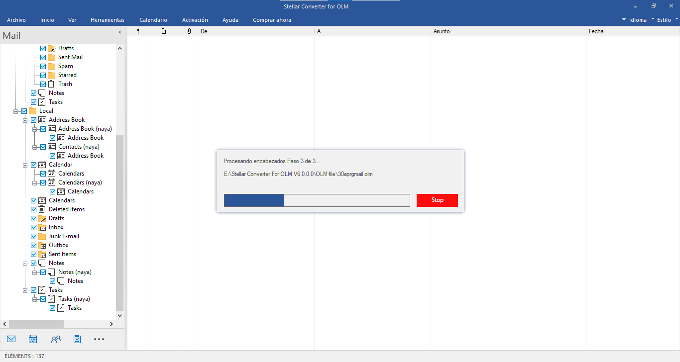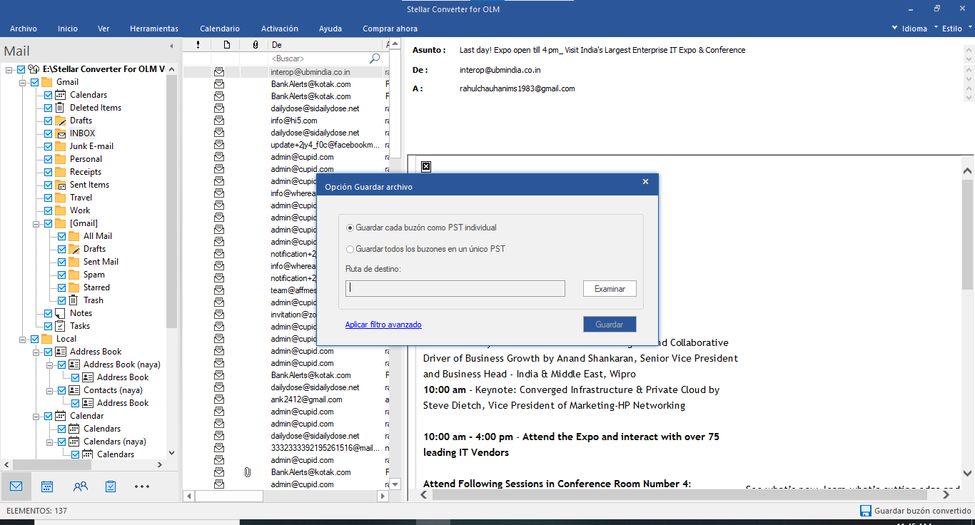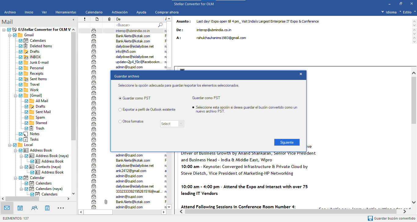 Paso 4:Guarde el archivo OLM convertido en el formato deseado: PST, exportación a un perfil de Outlook existente u otros formatos.