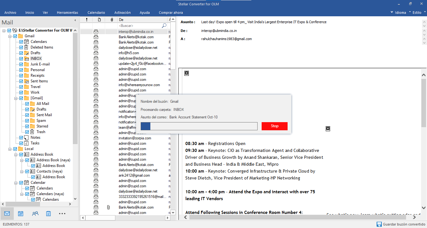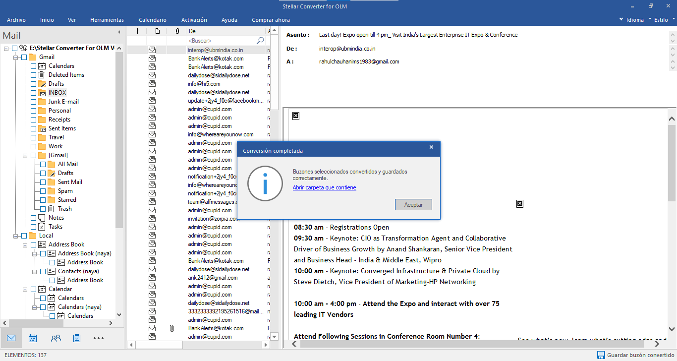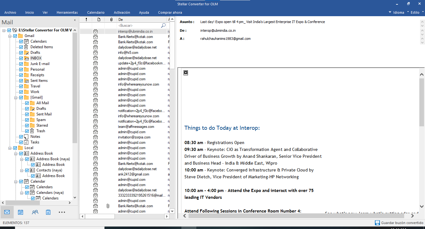 Paso 3:Tras la conversión, el software muestra una vista previa de todos los componentes del buzón del archivo OLM de Outlook para Mac.